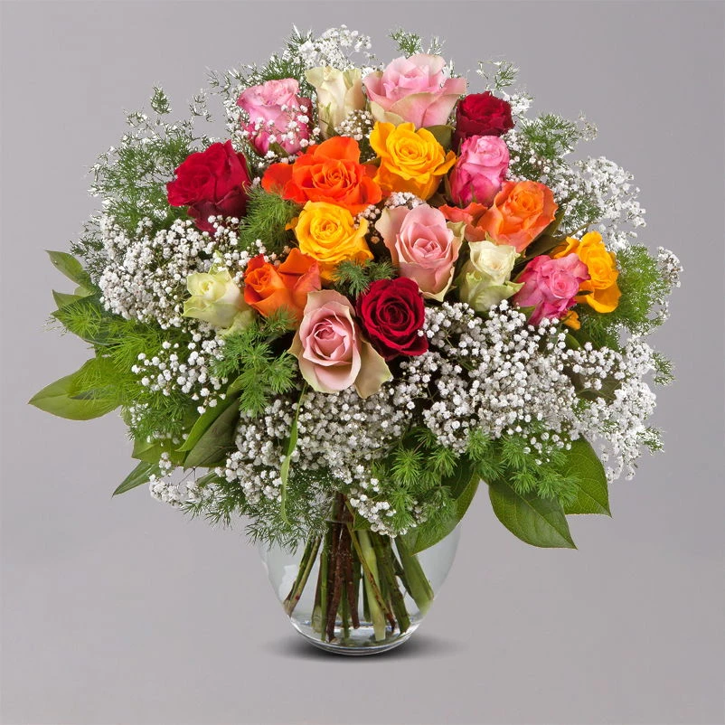 Mit diesem üppigen, exklusiven Floristik-Strauß (Ø ca. 33 cm) festigen Sie Ihren Platz im Herzen Ihrer Liebsten. Die traumhafte Rosensymphonie besteht aus insgesamt 18 großköpfigen, edel gefüllten Rosenköpfen, die farblich perfekt miteinander harmonieren. Den strahlenden Mittelpunkt des romantischen Liebesbeweises bilden sechs zart rosafarbene Rosen, die im vollkommenen Einklang zu jeweils drei gelben, weißen, orangefarbenen und roten Rosen stehen.