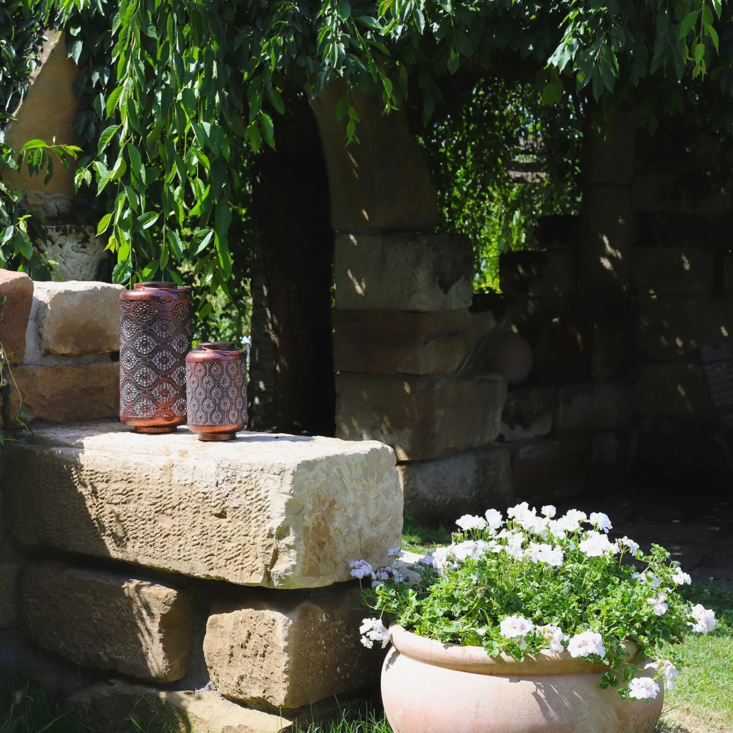 Die Solarlaterne Adana von unserer Eigenmarke setzt dekorative Lichtakzente und wertet den Außenbereich Ihres Hauses merklich auf. Diese solarbetriebene Leuchte besticht mit anspruchsvollem Design und einer aufwendigen Verarbeitung. Ihrem Garten, Ihrem Balkon oder Ihrer Terrasse verleiht das Modell orientalisches Flair und fügt sich in Ihr Beleuchtungskonzept flexibel ein. Dank des Solarbetriebs benötigt die Laterne keinen Stromanschluss und lädt sich tagsüber auf, um Sie beim Einbruch der Dunkelheit mit magischen Lichtspielen zu verzaubern. Sie können je nach Wunsch die Solarlaterne Adana als Tisch- oder Bodenleuchte einsetzen und mit dieser formschönen Lichtquelle den Eingangsbereich verschönern oder zum Beispiel für romantisch-exotische Lichtmomente bei einer Feier sorgen.