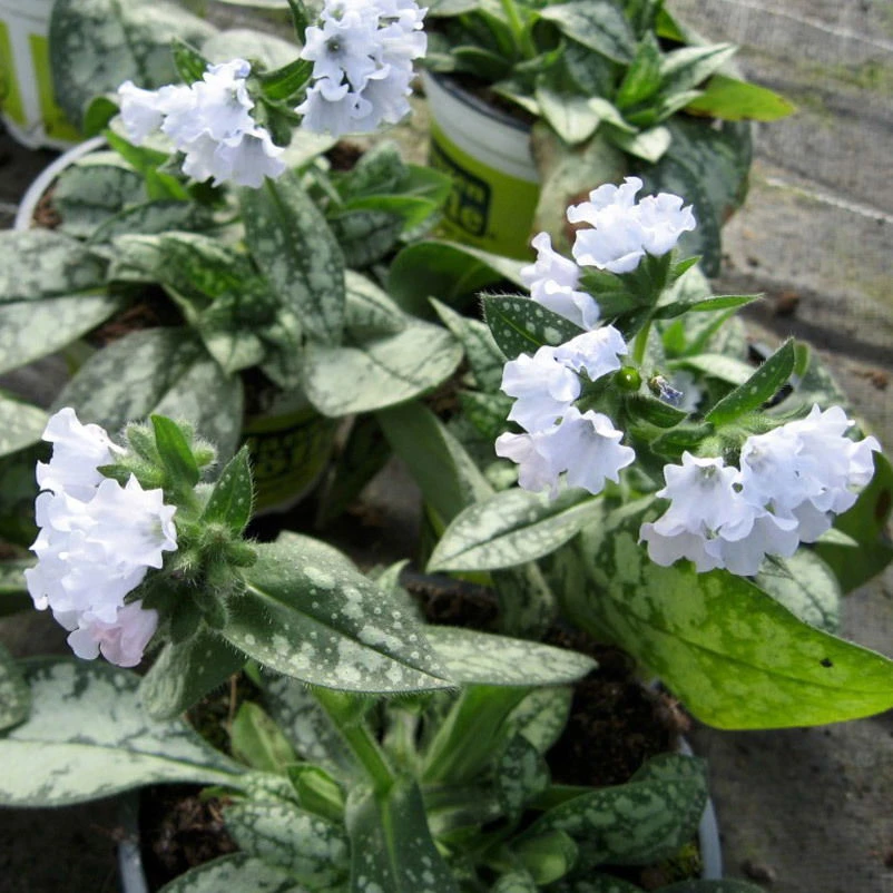 Das Lungenkraut ‚Opal‘ (Pulmonaria ‚Opal‘) ist ein wunderschöner Frühlingsblüher mit großflächig silbrig gefleckten Blättern und Blüten, deren Knospen blau sind und im Aufblühen zart blau werden.